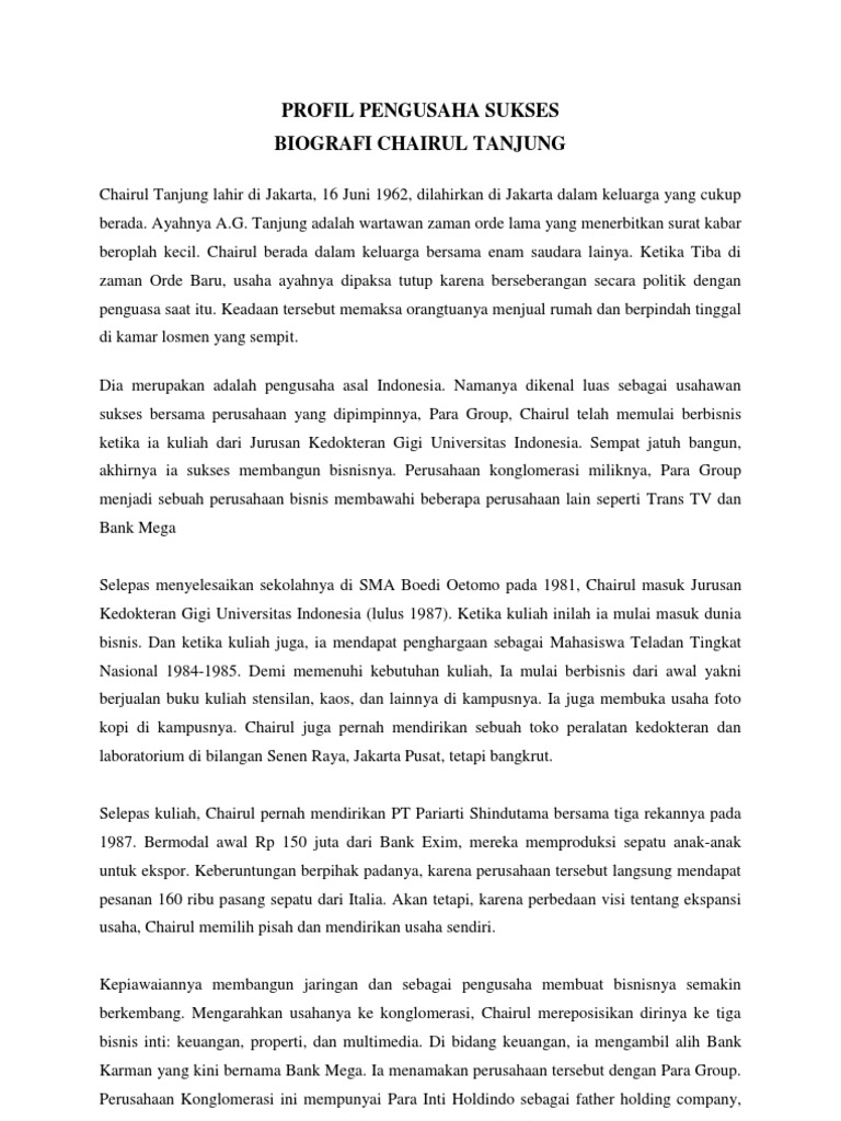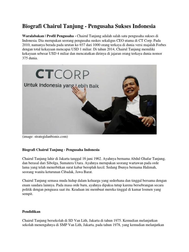 BIOGRAFI CHAIRUL TANJUNG PDF - Biografi Chairul Tanjung on WN Network delivers the latest Videos and Editable pages for News Events including Entertainment Music Sports Science Timothy Glenn PDF Timothy Glenn PDF. Jakarta 16 Juni 1962 Orang Tua. PROFIL PENGUSAHA SUKSES BIOGRAFI CHAIRUL TANJUNG.